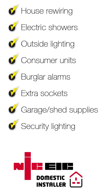 Being associated with NICEIC warrants the confidence and assurance of our clients knowing that their requirements will be undertaken professionally. We undertake Services including, house rewiring, electric showers, outside lighting, consumer units, burglar alams, extra socket, garage and shed supplies and security lighting.